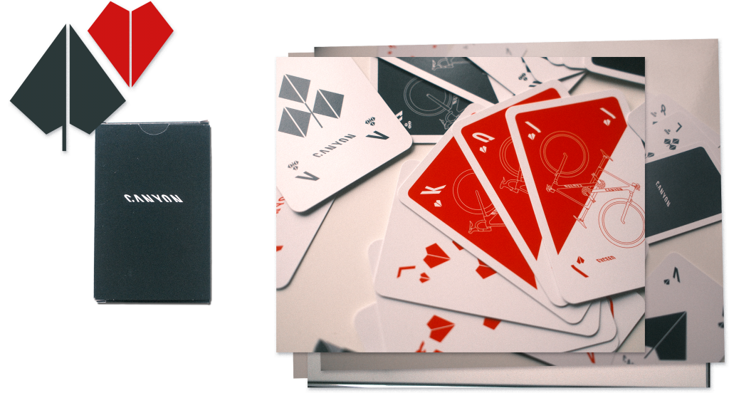Bild- und Schriftmarke waren vorgegeben (unten links), sowie strikte Corporate Guidelines, die es einzuhalten galt. Idee war, die notwendigen Symbole des Kartenspiels an die Bildmarke anzulehnen, sowie die Farb- und Formgebung aller Elemente an die für CANYON typische Ästhetik der Fahrräder anzulehnen.